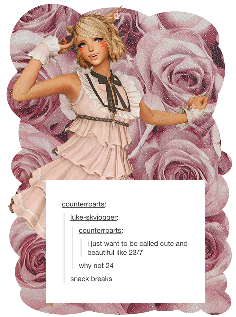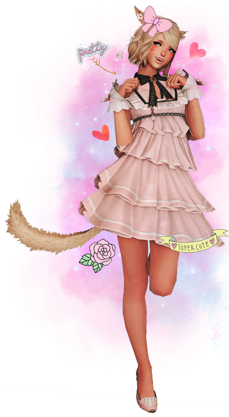 Despite being tiny in stature, it's difficult to miss this miqo'te in a crowd with her penchant for rose coloured garb. Animated and cheerful in nature, it seems as if nothing at all bothers the blonde as she prances around with a skip in her step. Heart worn on her sleeves, her ears often give away her true feelings that lay beneath the cheerful mask she adorns which suggests that perhaps not everything is entirely as rosy as she paints it out to be.