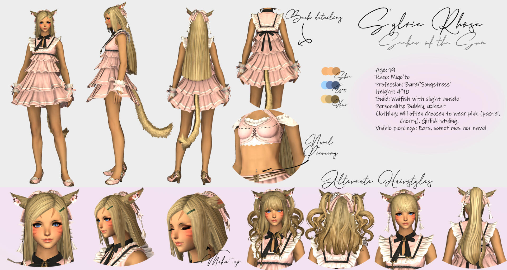 I'm over the age of 21 and prefer the people I roleplay with to also be over this age. I've been roleplaying for way too long and I'm open to all types - just ask if you're not sure. I try to write paragraphs whenever possible but sometimes, especially in busy areas, it's easier not to.I'm based in the UK so it can be a little difficult to catch me to arrange stuff and I'd like it if that could be kept in mind when planning stuff. Staying up until 5am every night is killing my skin and sleep schedule.Discord? Perhaps. I'm picky on who I give it out to. It's a me issue, not a you issue.Final Fantasy is my main roleplay source so I'm around a lot. I do get a little anxious about walking up to people (even friends!) so I appreciate it when people walk up to me.I enjoy doing higher end content and listening to k-pop (although S'ylvie is very much a j-pop inspired character!). Kudos if you caught most of the references - I'm still not over IZ*ONE disbanding.
